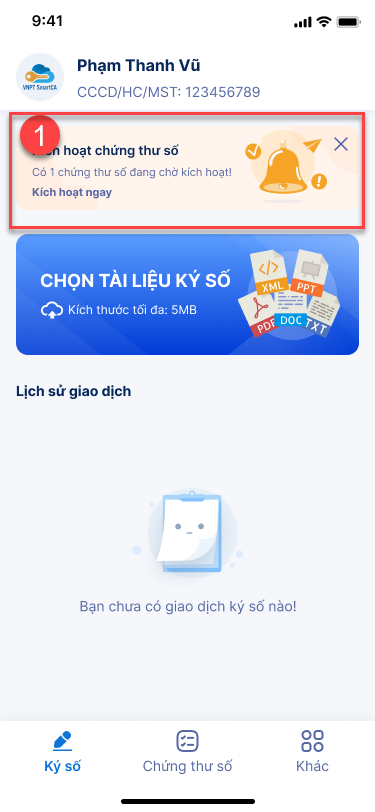 - Bấm chọn Kích hoạt ngay tại thông báo kích hoạt chứng thư số ở trang chủ.
