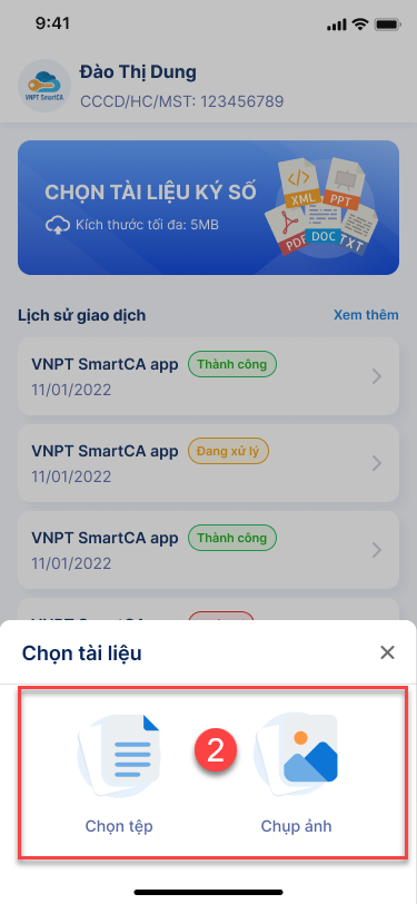 - Bấm "Chọn tài liệu cần ký số" sau đó bấm Chọn tệp (các file tài liệu từ thiết bị người dùng) hoặc Chụp ảnh.