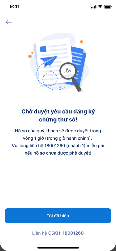 Quý khách vui lòng đợi VNPT thẩm định hồ sơ và duyệt cấp Chứng thư số