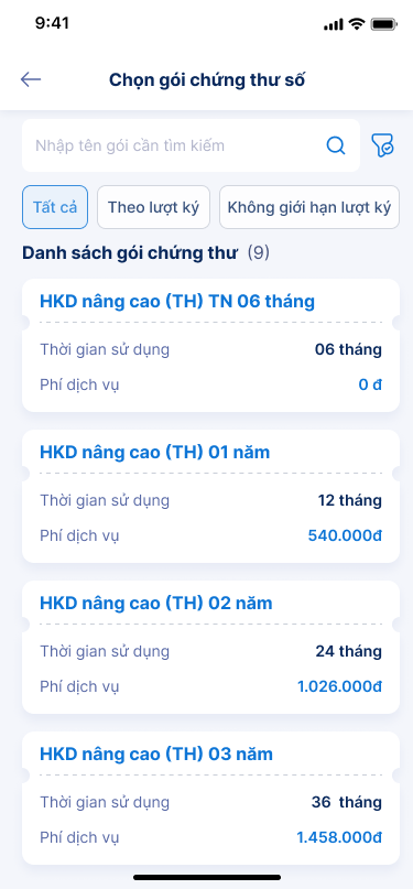 - Lựa chọn gói Chứng thư số theo nhu cầu.